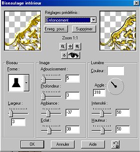 #13 Faire "Effet/Filtres Plug-In/Flaming Pear/SuperBladePro".Et appliquer le "Preset Gold01" ou "Gold02" , vous pourrez essayer avec d'autres "Presets"pour changer l'effet ainsi obtenu.