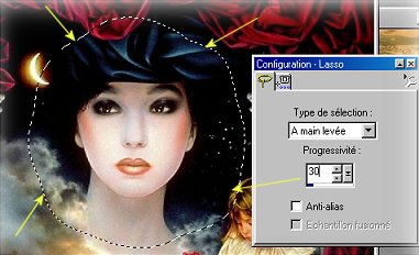 Avec l'Outil "Lasso" et les réglages ci dessous, détourer le Visage.